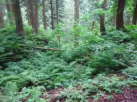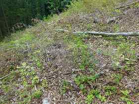 | 尾根を登って行くと最初に遭遇する堀切。しかし、城まではまだまだである。 | 4郭手前まで来ると、急に視界が開けてくる。城の東側の木がすべて切られていた。何かの山作業を行っているようだ。 |