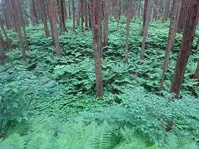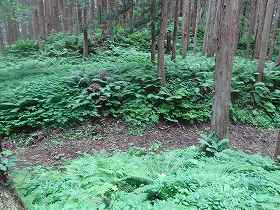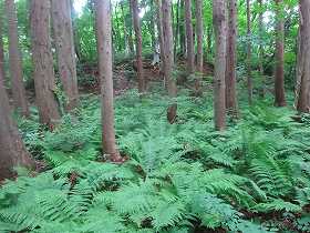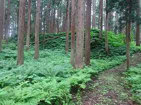 | 1郭城塁と横堀。城塁の高さは10mほどもある。 | 西側の畝城竪堀群。畝の大きさは人の背丈ほどもあり、かなり大きい。 |