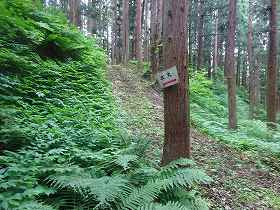 山麓近くのこの辺りの位置に城址標柱が立てられており、城への入口を示している。
