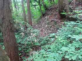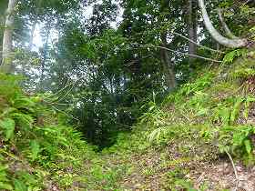 | その先の尾根にある堀切。 | 7郭側面部の道を通って行くと、城塁半ばほどに横堀が形成されているのが見えてくる。 |