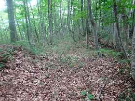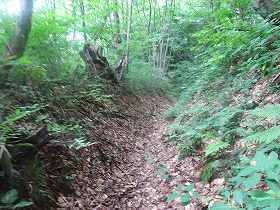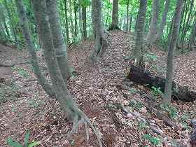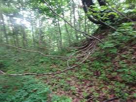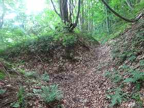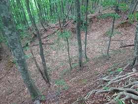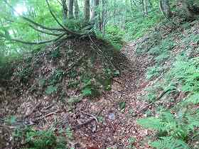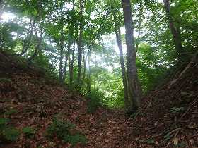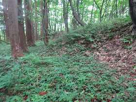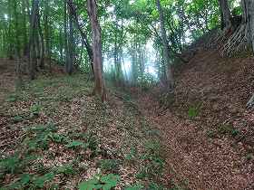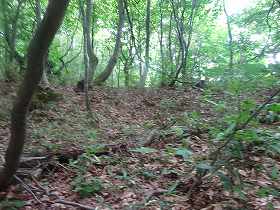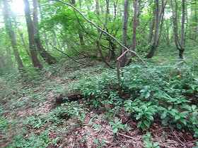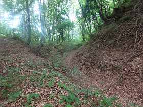ここからも尾根は続き、途中に堀切跡かと思われる鞍部と、実際に堀切形状を残している個所が見られる。その先から尾根は登りにさしかかり、斜面の途中には横堀が見られるようになっている。