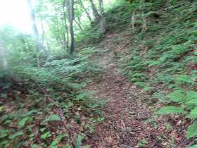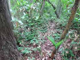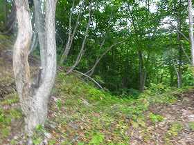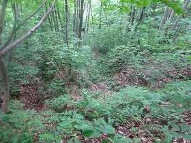 | 横堀の先の尾根に掘られた堀切。城域はここまでである。 | 再び、6郭先端部下の鞍部まで戻ってきた。 |