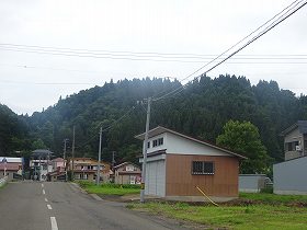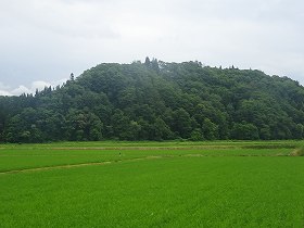 | 南側から遠望する田代城。ここからの比高は90mほど。 | 山麓に鳥居が見えている。この上の神社から登り始めた。 |