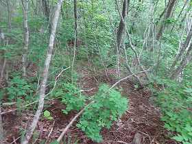 やがて城の尾根の北端部下に到達する。ここから道はないので尾根を直登していくしかない。しかし、田代城の険しいヤブ斜面を登った後であったので、それに比べれば尾根の高さも鋭さもヤブも、まったくたいしたことがない! 比高40mほどの高さしかない尾根なので、すぐに登れてしまった印象である。