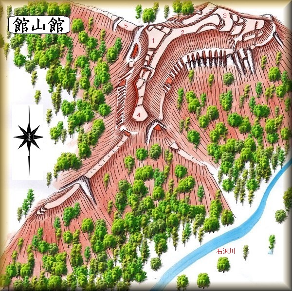 館山館は、石沢川が西側に大きく蛇行する地点にそびえる比高60mほどの山稜に築かれており、googlemapにも掲載されている。