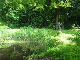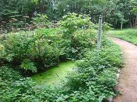 | 本丸下の腰曲輪。 | その下にある馬屋跡と池。 |