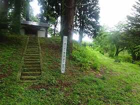 | 御社壇への階段。五社壇は実質的には櫓台である。 | 本丸の標柱と案内板。 |