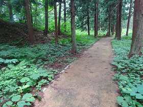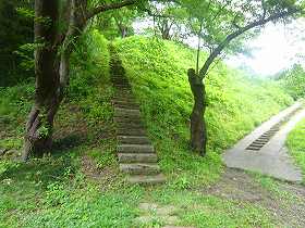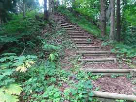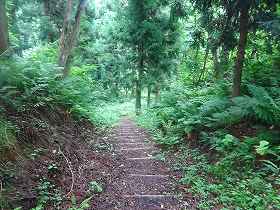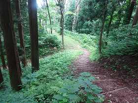 裏道というのが本来の登城道であり、急な尾根をそのまま登って行く道である。それに対して表道というのは、城址を公園化した際に付けられた近代の道であり、北側の側面部を削って緩やかに登って行くようになっているらしい。