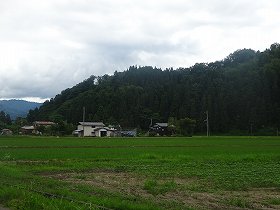 | 北側から遠望する八幡林城。ここからの比高は90mほどある。 | 民家の間を抜けて、池の脇から入って行けそうであるが、夏場はヤブなので、今回はパス。 |