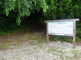 | 北方から遠望する小野城。ここからの比高は90mほど。 | 登城口の案内板。駐車スペースもある。館公園として整備されているはずなのだが・・・。 |