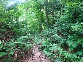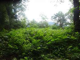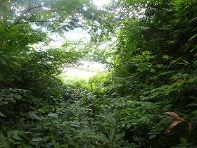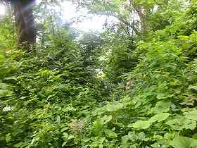 | 途中の道はけっこうなヤブであった。やっと到達した2郭も御覧の通りの状態でまるで入って行けない。 | 登城口。ヤブに埋もれてしまっている。 |