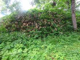 1重目の堀切まで戻ってきて、今度は城の南側の斜面に回り込んでみた。こちら側には合計20本ほどの畝状竪堀が造成されているのである。ところがヤブがひどくて夏場では明確に視認することは困難な状態であった。畝の高さは1m未満であり、規模はそれほど大きなものではないが、何しろ数が多いので圧倒的である。