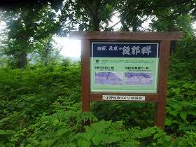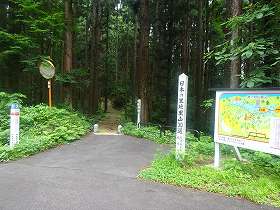 | 山麓から遠望する湯沢城。ここからの比高は140mほどある。 | 林道湯沢城線を進んで行くと、城内への入り口案内が見えてくる。ここから尾根伝いに城址に向かう。 |