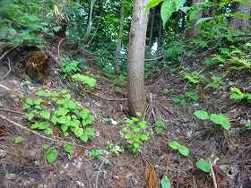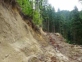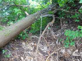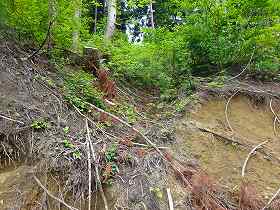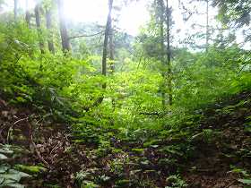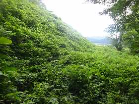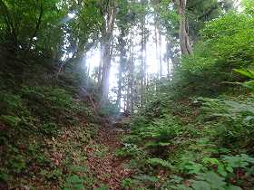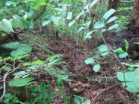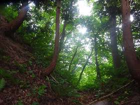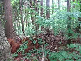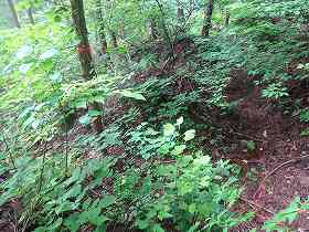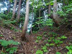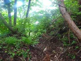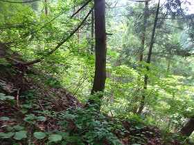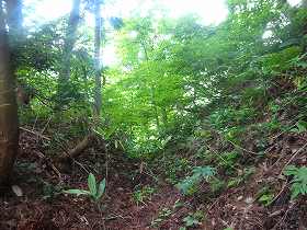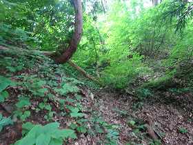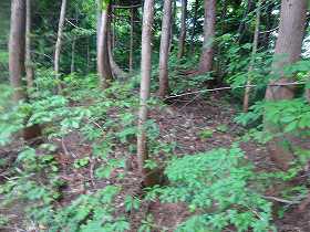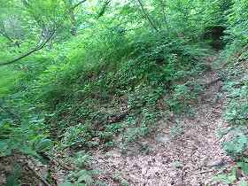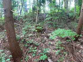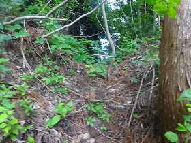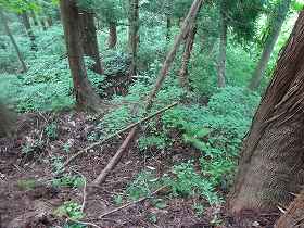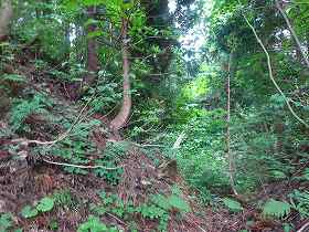 | 南側に尾根を降りていったところにも堀切があった。 | その先の切岸。 |