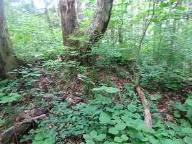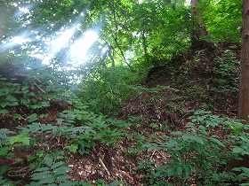 | その祠。ここから先は尾根をひたすら直登するしかない。 | 最初に遭遇するAの郭の脇の土塁。 |