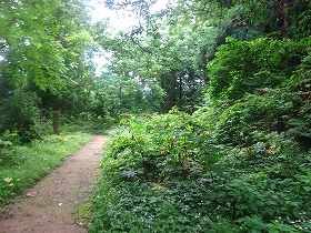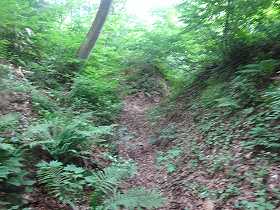 | 再び畝状竪堀群。 | 1郭から今度は本来の登城道を通って、下に降りていく。こちらの切通し通路もヤブだらけである。 |