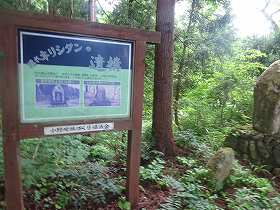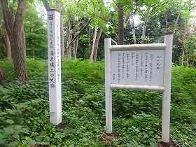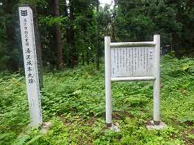 表示のあるところの脇には池があり、そこに「馬屋」の案内が立てられていた。表示の通りであるとすると、ここに馬小屋を置き、馬を飼っていたということになる。池は井戸であると同時に、水分を大量摂取する馬のためのものであったかもしれない。