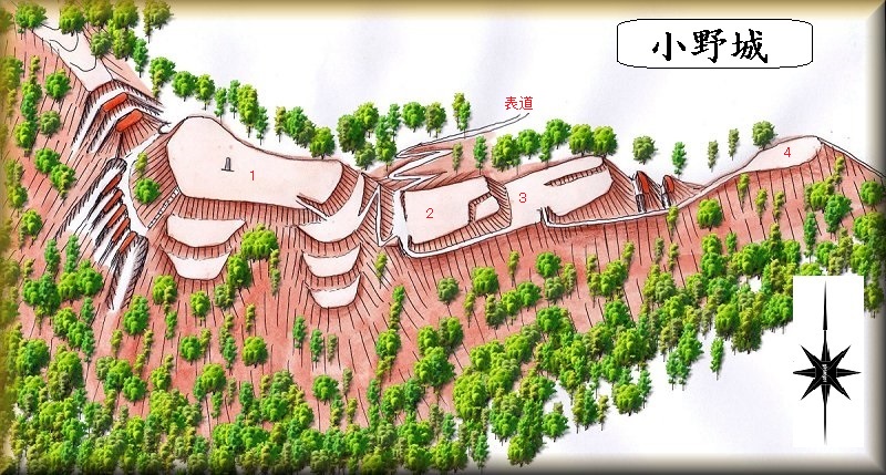 | 城の歴史について詳しいことは分からないのだが、小野寺氏の家臣柿崎氏によって築かれたのではないかと言われている。「小野」という名称そのものも小野寺氏に関連するのではないかと思われるので、小野寺氏に関係があったことは間違いないと考えられる。 柿崎氏は代々小野寺氏の家臣として、仙北地域への侵攻に際して貢献したというが、元亀2年(1571)、別の家臣からの讒言があったため、城主であった柿崎隆資は、小野寺輝道に謀殺されてしまうことになる。 文禄4年(1595)、最上氏によって湯沢地区への侵攻が行われ湯沢城も落城した。小野城には町田右衛門が300人を率いて籠城していたが、最上勢に攻められて落城してしまうことになる。 |