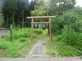 | 北東側から遠望するしなの館。ここからの比高は160mほどある。 | 野中自治会館の隣にある鳥居。ここから神社跡の祠のあるところまでは山道が付いている。 |