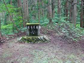 最初は整備された山道なのでとても歩きやすい。比高30mほど登ったところで、神社の跡に到達した。道はここまでである。後はその背後の山稜をひたすら直登していくしかない。