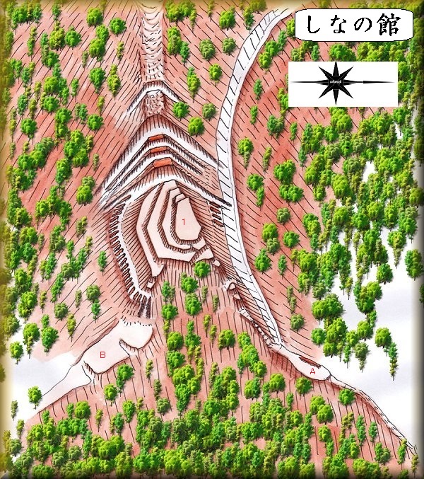 | これだけの城であるというのに、しなの館の城主等、歴史については未詳である。遺構的には小野城と似た要素が多く、小野寺氏の境目の城として構築された城の1つであったのではないかと推測できる。 想像するに、文禄5年(1595)の最上氏の侵攻に際して、境目の城として築かれたものだったのではないだろうか。最上氏は湯沢城まで攻め落としているので、その際の攻防で、しなの館も攻め落とされてしまった可能性が高いと考えられる。 |