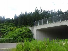 | 北側から遠望する臼館。ここからの比高は70mほど。 | 現在は入口を塞ぐようにトンネルと道路が設置されている。 |