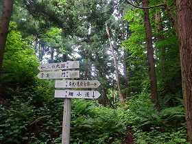 本丸から通路を先に進むと、腰曲輪の中を通ってその先の鞍部に到達する。ここが通路の分岐点となっており、各方向への案内表示も設置されている。