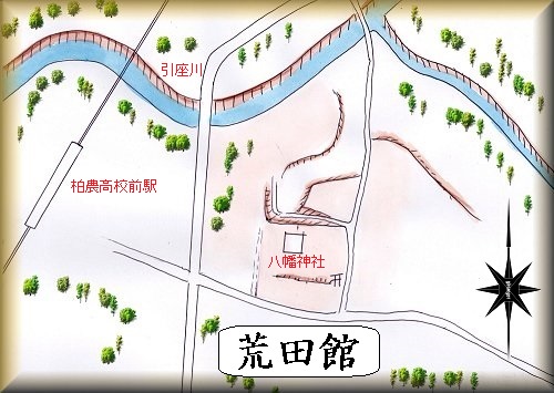 荒田の八幡神社のある一帯が荒田館の跡であるという。やはり引座川の南側に位置した城館である。
