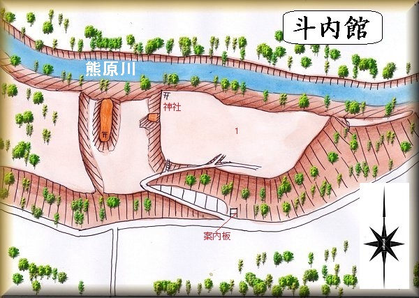 斗内館は、熊原川の南側にそびえる台地上に築かれている。北側の川に面する部分は断崖状の地形となっている。