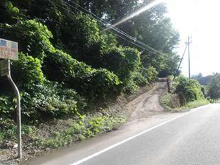 北側の道路を通っていると、稲荷神社の祭られている本郭の下の所に出る。ここに案内板が設置されており、車を停められるスペースもある。