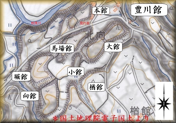 本館の場所と案内板 馬場館の場所 堀館の場所 向館の場所 小館の場所 大舘の場所 楢館の場所