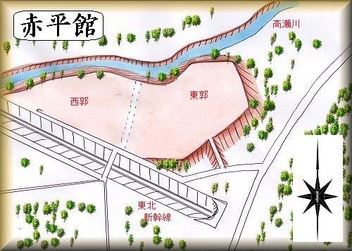赤平館は二津屋館のすぐ南西部に位置している。やはり、高瀬川に臨む台地であり、南西部分を東北新幹線の線路によって削られてしまっている。