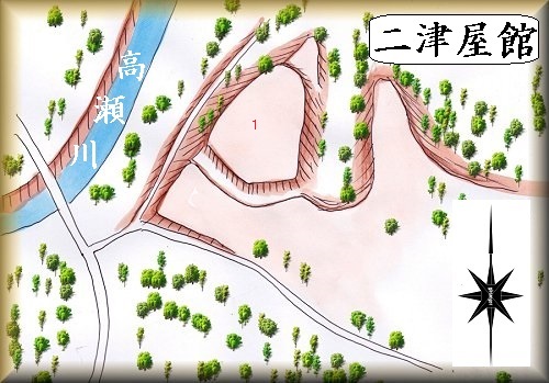 新館地区農村公園から北側に進んで行った所にある。やはり高瀬川に臨む台地縁部に築かれた城館で、3つの城館が並行して存在している。