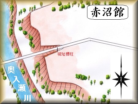 この切通しになっている部分の南側の上に「赤沼備中館」と書かれた標柱が立てられている。その背後には土塁らしきものも見えている。
