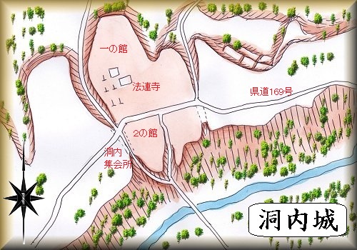 県道169号線沿いにある法蓮寺の境内が洞内城の跡であるといい、館地名が残っている。。