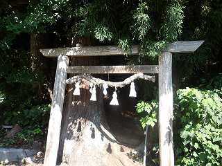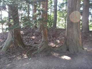 神社入口の辺りは堀跡だったのではないかと思われる。境内に上がってみると南側には土塁が盛られているのが分かる。