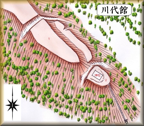 川代の集落の背後にそびえている比高30mほどの山稜先端部分が川代館の跡である。
