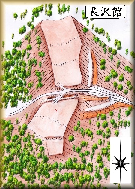 長沢集落の北側に位置している。台地上には大きく2つの郭があり、いずれも広大な畑となっている。