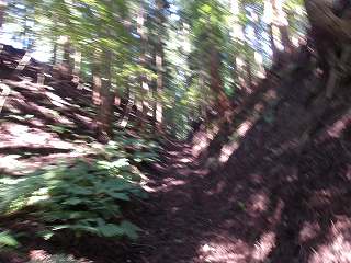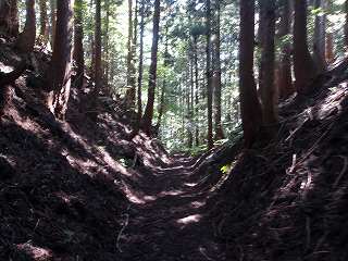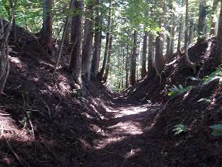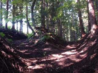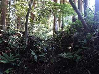 この道は1と2との間の堀切を活用したもので、現在も堀切らしい雰囲気を残している。1郭の東側の下には横堀も掘られており、前面の防衛構造としている。