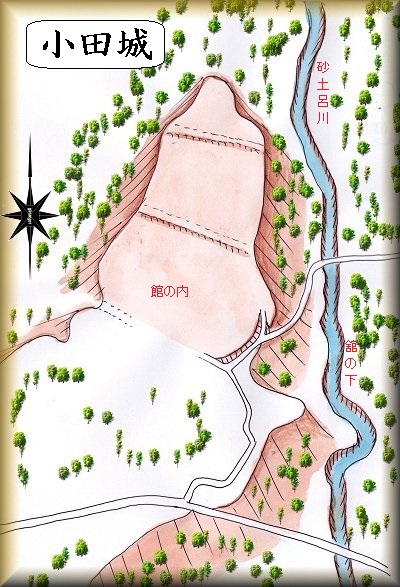 小田城は、織田集落から砂土呂川に沿って北側に延びた比高20mほどの台地に築かれていた。