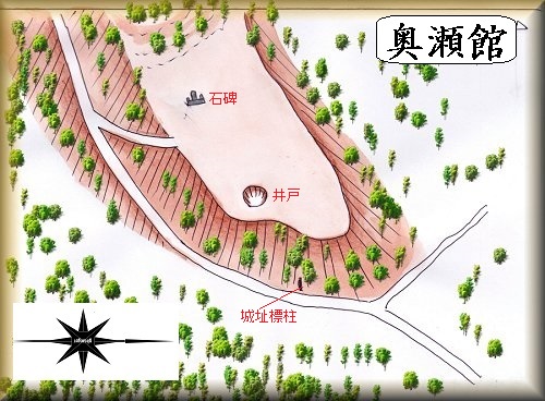 奥瀬の集落の南側の背後にそびえる比高20mほどの山稜が奥瀬館の跡である。集落から南側に進んで行くと、館の先端下の所に城址標柱が立てられているのが見えてくる。