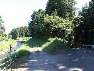 | 西方から遠望する赤沼館。 | 中央を斬り通している道路。 |