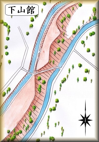 この2本の用水路に囲まれた山林地帯と畑が下山館の範囲とされている。