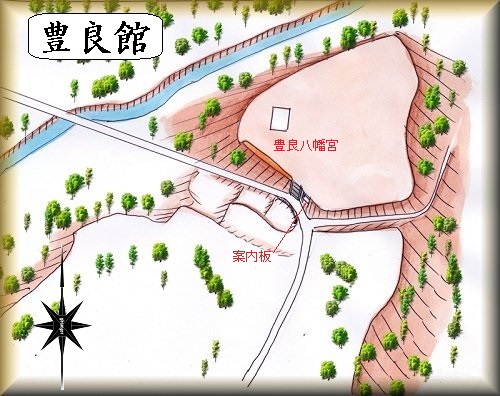 豊良集落から北東に突き出した台地先端部が豊良館の跡である。館跡は豊良八幡宮の境内と一軒のお宅の敷地となっている。