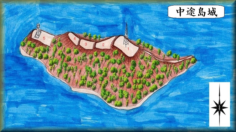 瀬戸内海に浮かぶ中渡島が中途島城の跡である。