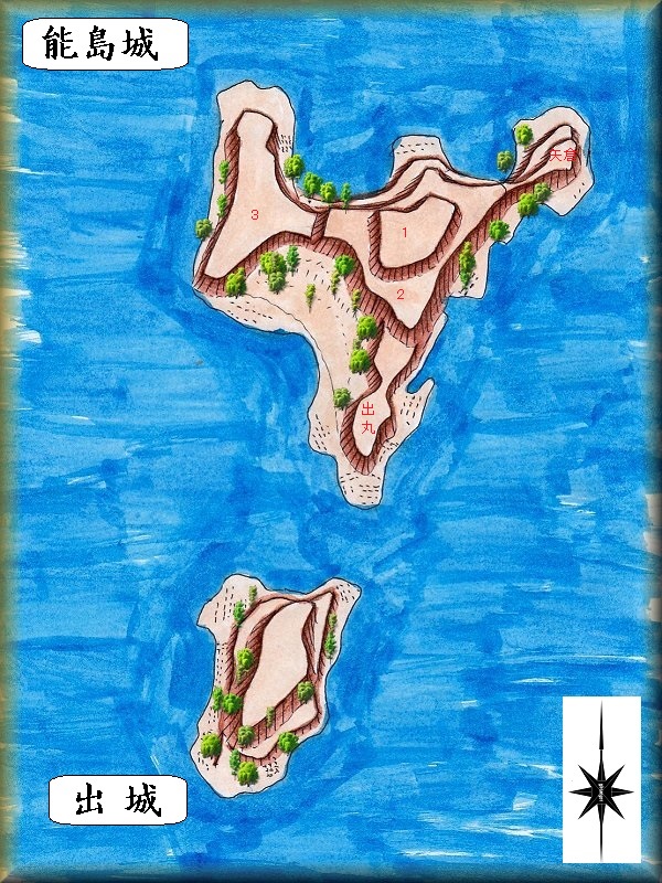 能島の地形を利用して配置した3つの郭が城の中心となっており、その他に北東側には矢倉、南側に出丸を配置していた。