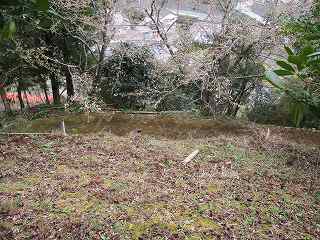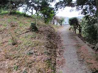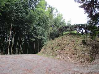 | 西方から遠望する拝鷹城。ここからの比高は30mほど。上は墓地になっている。 | 墓地の駐車場まで来た。ここはかつての堀切跡であろう。 |