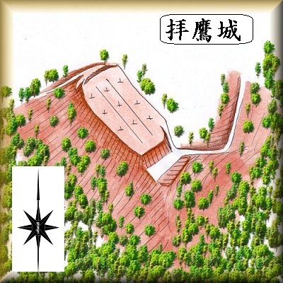 佐礼谷小学校のすぐ南側にある比高30mほどの山稜先端部分が拝鷹城の跡である。城内は共同墓地となっており、そこまで行けるように車道が付けられている。その入口はこの場所である。