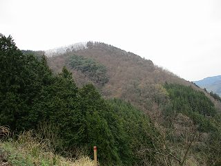 とても登りたくなくなるような山なのであるが、林道の峠部分からだと比高30mほど登れば城内に到達することができる。峠のところには車一台停められるスペースがあるので、ここに車を停めて登り始める。