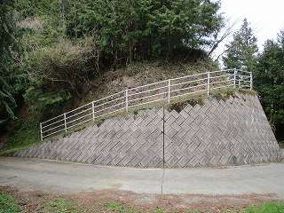 墓地はけっこう大きなもので、おそらくこの地区のお宅の墓地はみな、ここに営まれているのであろう。航空写真を見ても分かるように、郭内部には墓地しかない。したがって郭内部には遺構は見られないが、周囲は切岸状の急斜面となっている。